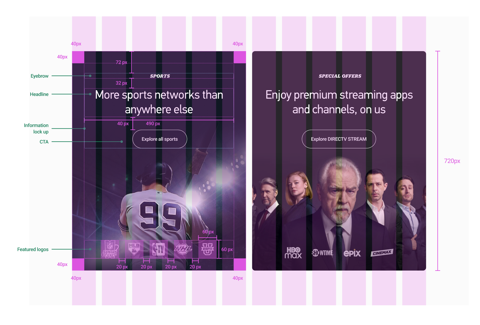 With a mobile first approach we identified the information architecture and designed a set of content cards that support DIRECTV’s offerings and can easily be stacked into clear landing pages.